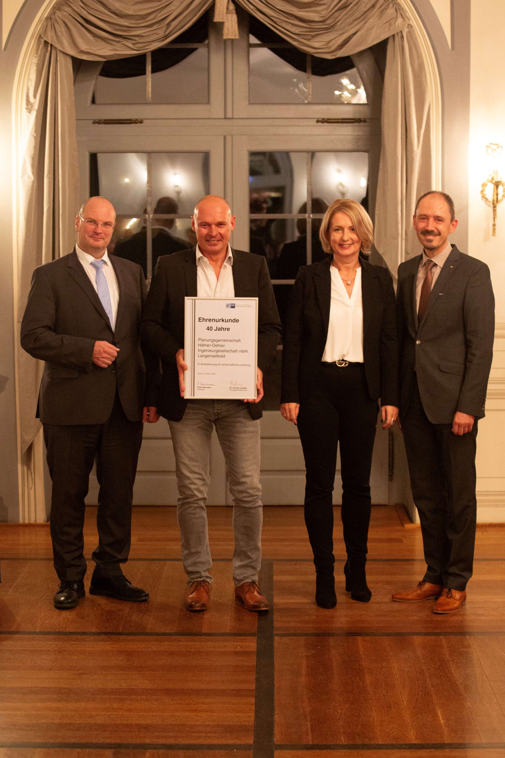 Beim Festakt am 17. Oktober im Arkadenbau im Staatspark Hanau-Wilhelmsbad überreichten IHK-Präsident Oliver Naumann und IHK-Hauptgeschäftsführer Dr. Gunther Quidde in festlichem Rahmen die Urkunde an unsere beiden Geschäftsführer Petra Häfner und Thomas Oefner.