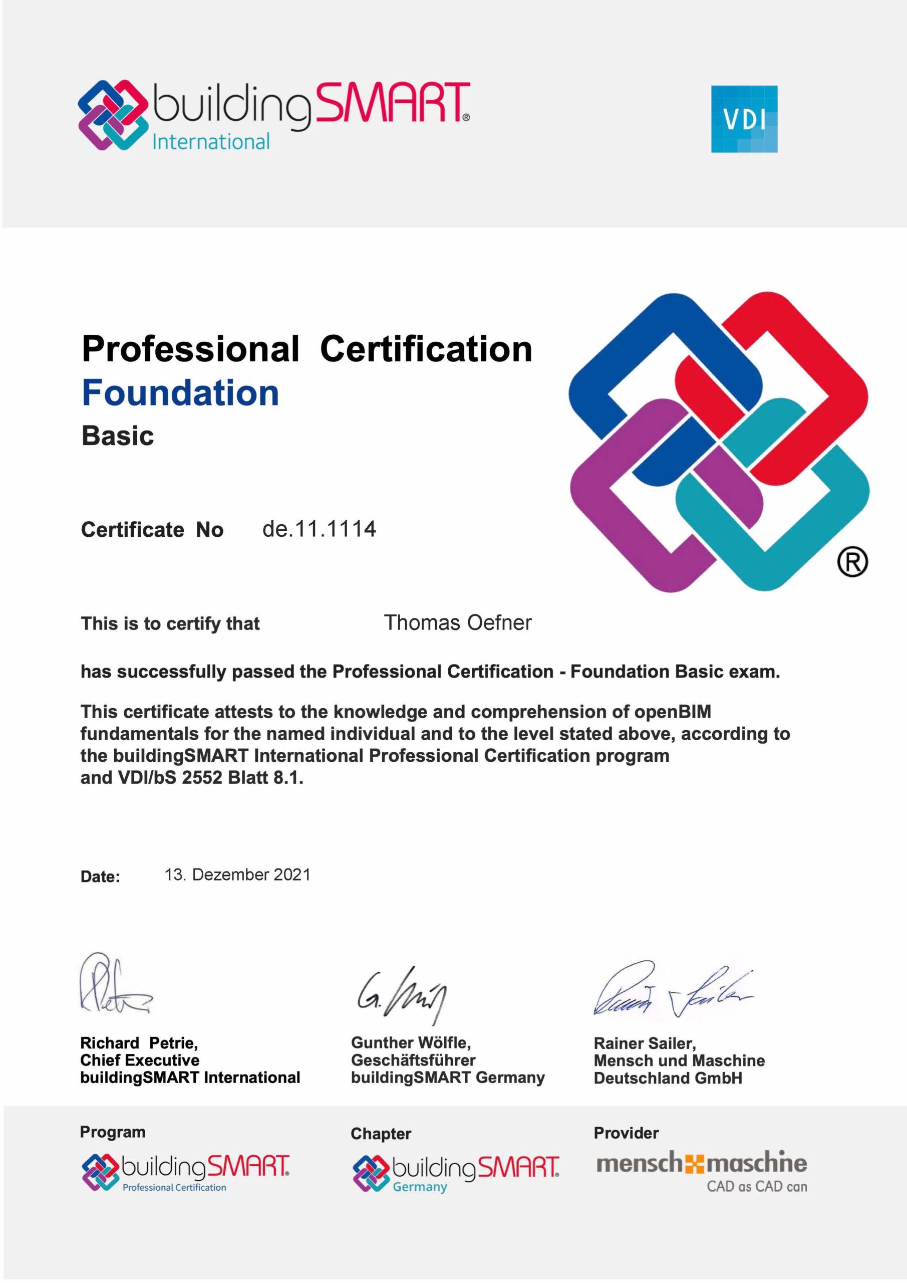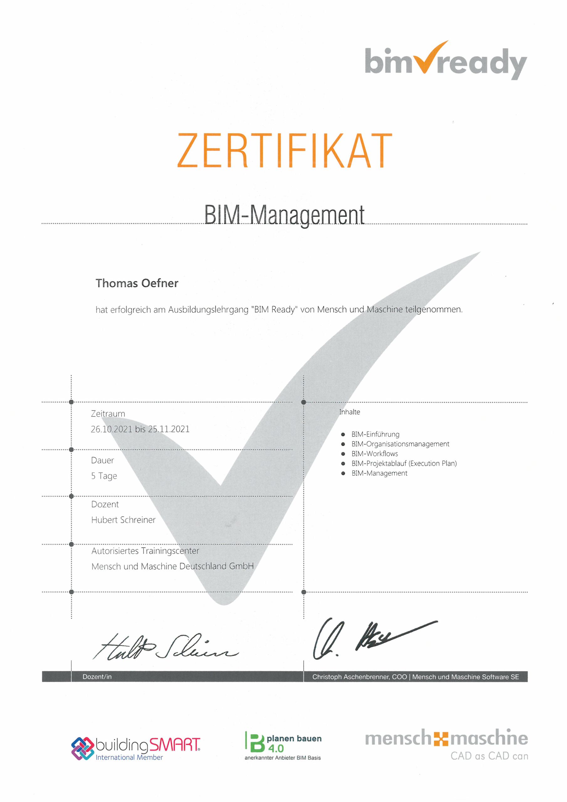 Unser Geschäftsführer, Herr Thomas Oefner, hat erfolgreich die Module 1 und 2 des Ausbildungslehrgangs BIM-Management der Mensch und Maschine Deutschland GmbH absolviert und die anschließende Prüfung bei der buildingSMART Professional Certification erfolgreich abgeschlossen. Unsere Auftraggeber und interessierte Kunden können die Qualifikation von Herrn Oefner im Internet bei buildingSMART einsehen (https://education.buildingsmart.org).