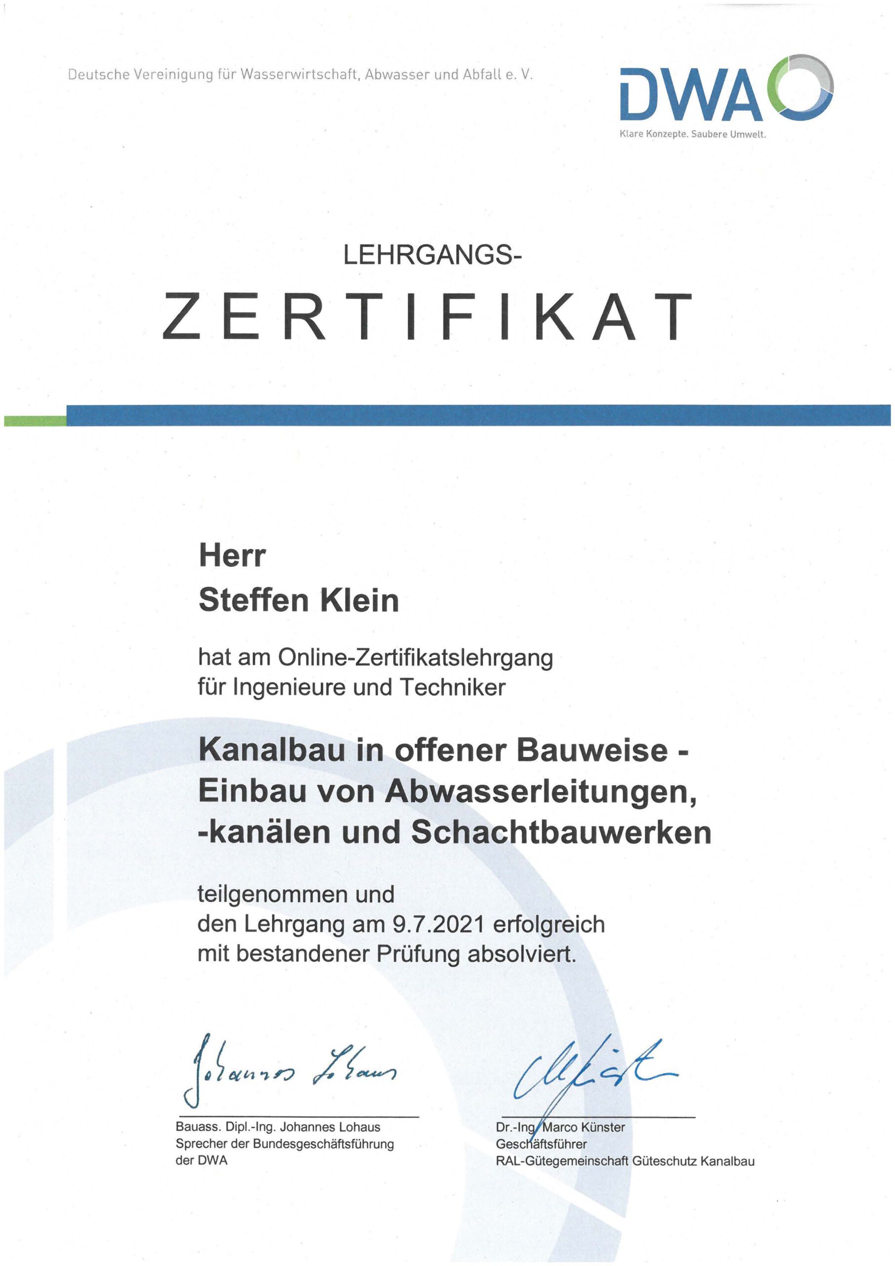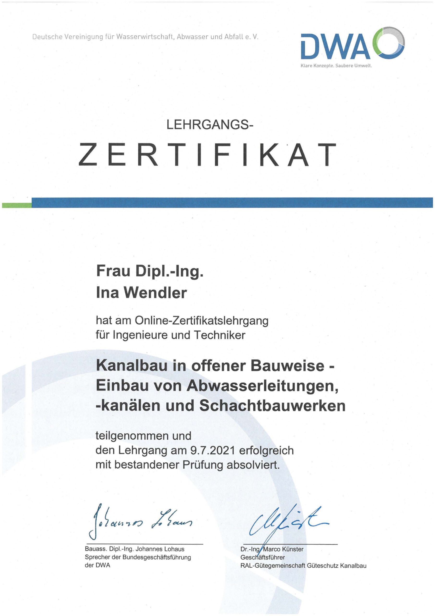 Frau Dipl.- Ing. Ina Wendler und Herr Dipl.- Ing. Steffen Klein haben sich im Rahmen eines Online- Zertifikatslehrgangs der DWA – Deutsche Vereinigung für Wasserwirtschaft, Abwasser und Abfall e. V. | RAL- Gütegemeinschaft Güteschutz Kanalbau im Fachbereich Kanalbau weitergebildet.