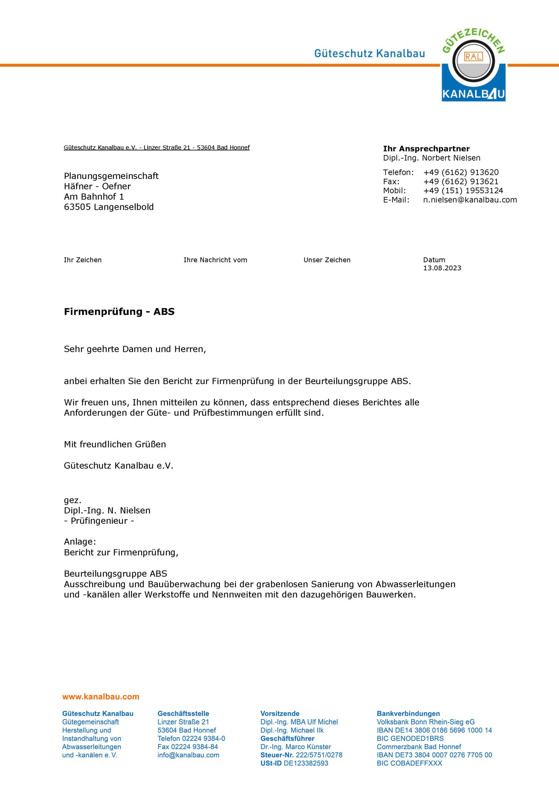 Im Rahmen einer Firmenprüfung im August 2023 wurde unserem Unternehmen seitens des Prüfingenieurs der Gütegemeinschaft Güteschutz Kanalbau e. V. auch für das Jahr 2023 bestätigt, dass wir alle Güte- und Prüfbestimmungen der RAL Gütezeichen Kanalbau ABS und ABAK erfüllen (Mitgliedsnummer: 7193, Prüfberichte Nr. 8, ID_FB-0001787 und ID_FB: ID_FB-0001788 vom 09.08.2023).