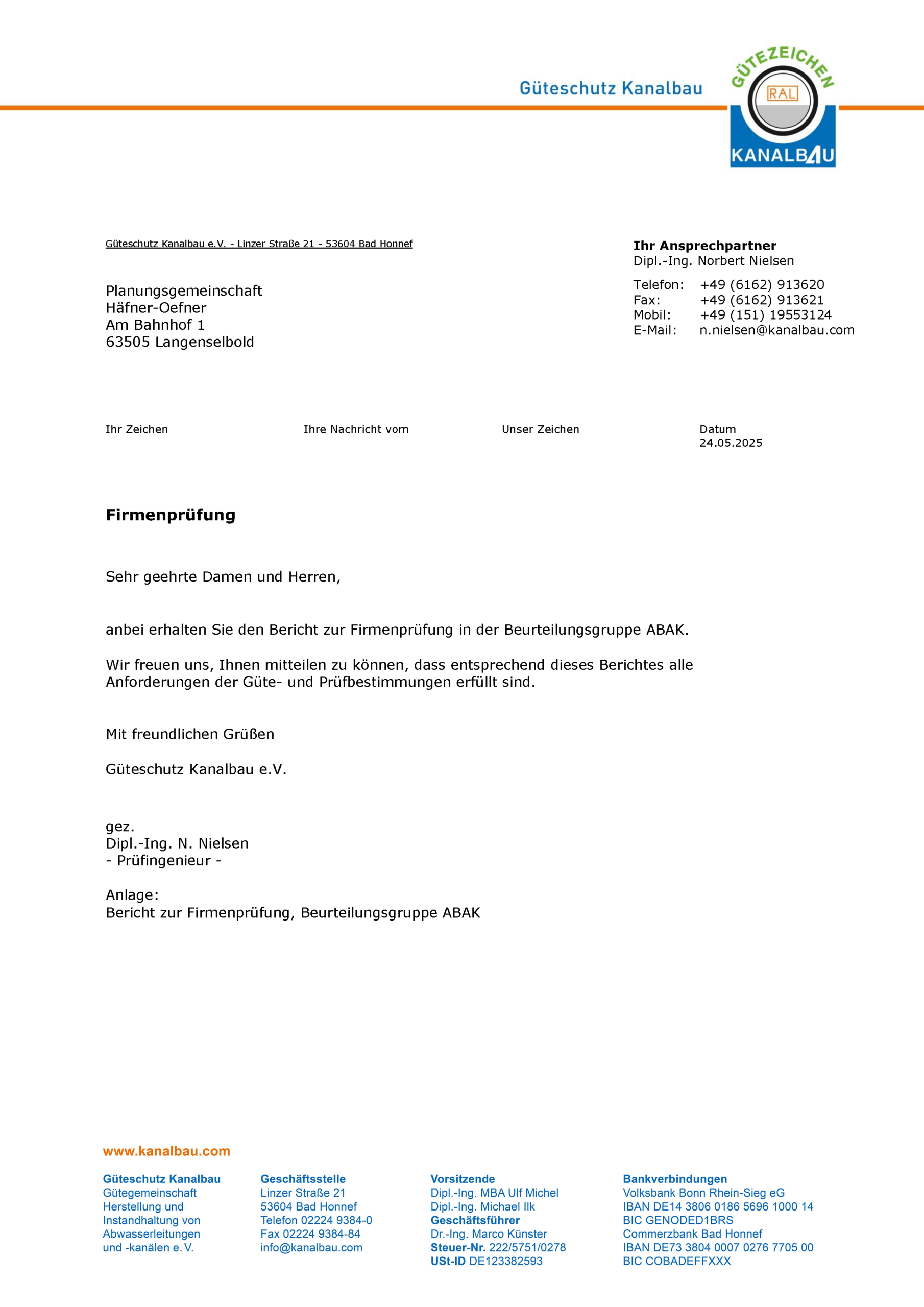 Im Rahmen der Firmenprüfung Ende Mai 2025 wurde unserem Unternehmen seitens des Prüfingenieurs der Gütegemeinschaft Güteschutz Kanalbau e. V. auch für das Jahr 2025 bestätigt, dass wir alle Güte- und Prüfbestimmungen der RAL Gütezeichen Kanalbau ABS und ABAK erfüllen (Mitgliedsnummer: 7193, Prüfberichte Nr. 10, ID_FB-0007352 und ID_FB-0007353 vom 24.05.2025).