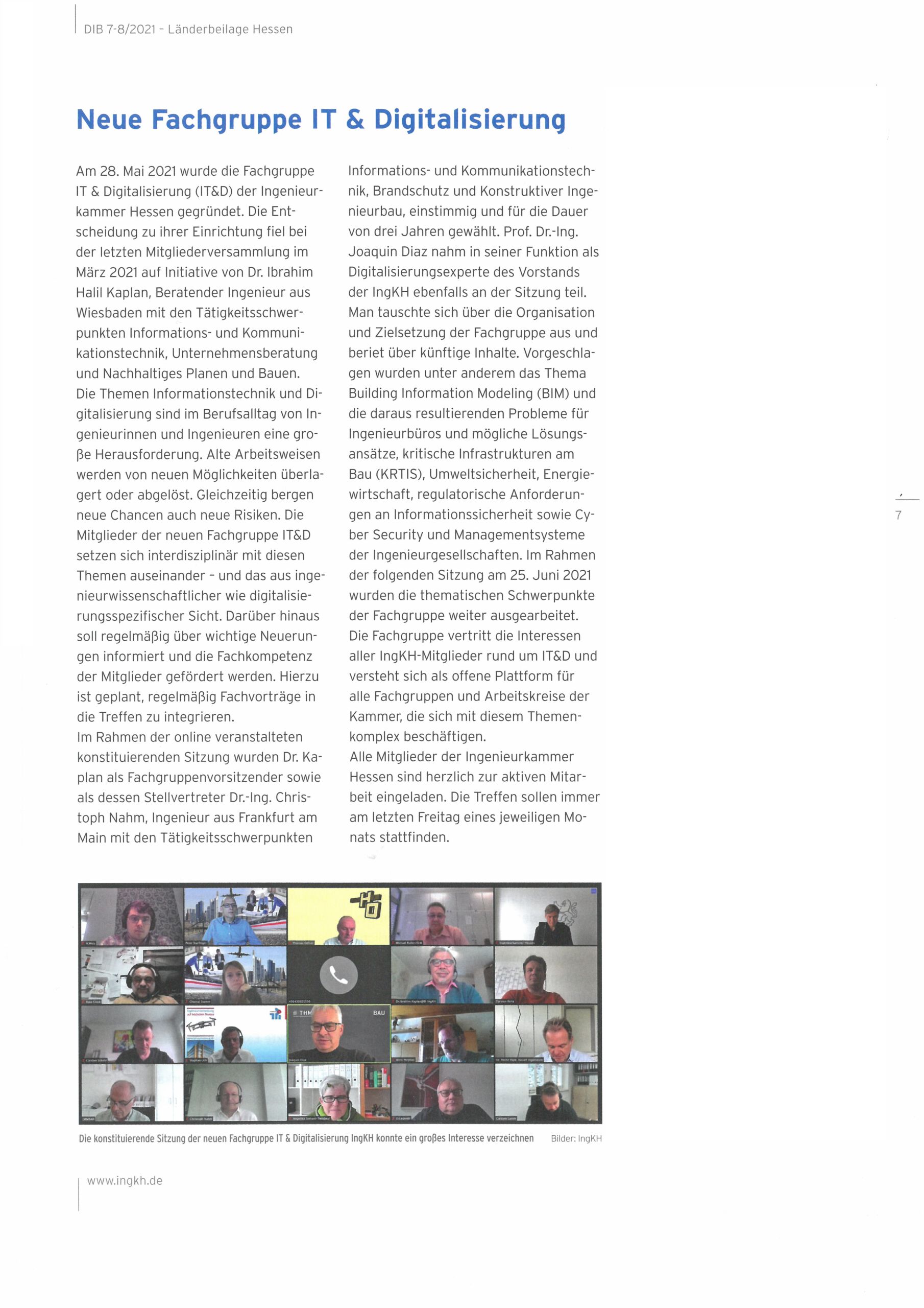 Die Ingenieurkammer Hessen K. d. ö. R. hat auf Ihrer Mitgliederversammlung im März 2021 beschlossen eine neue Fachgruppe IT & Digitalisierung (IT&D) zu gründen.