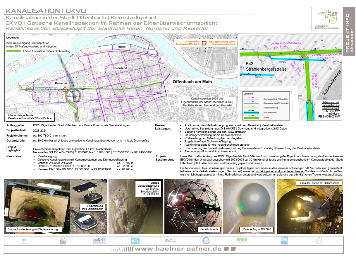 Ein besonderes herausforderndes und innovatives Projekt konnten wir für die ESO Stadtservice GmbH | Stadtwerke Offenbach, welche für den Betrieb der Kanalisation der Stadt Offenbach zuständig ist, planen und in der Umsetzung begleiten. Von über 30 Km zu inspizierenden Kanälen im Kernstadtbereich (u. a. im ST Kaiserlei), wurden über 4 Km Großrohrprofile der Dimensionen DN 2000 – DN 2200 sowie RE 2600/2300 bis RE 2400/3000 mittels einer Kanaldrohne beflogen.