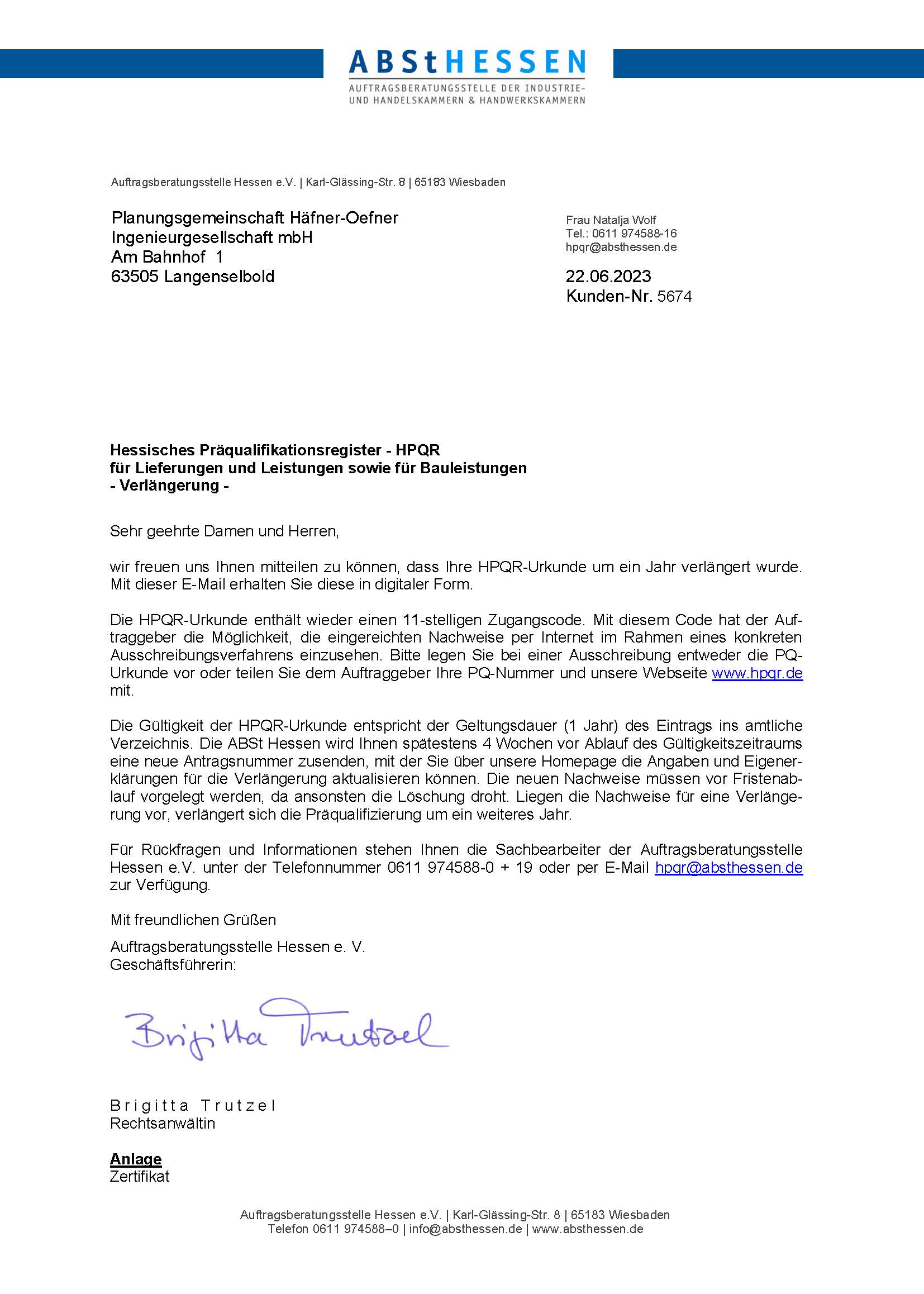Die Planungsgemeinschaft Häfner- Oefner Ingenieurgesellschaft mbH ist ab sofort in der Präqualifizierungsdatenbank unter der Zertifikatsnummer 06006WCRAKW eingetragen.