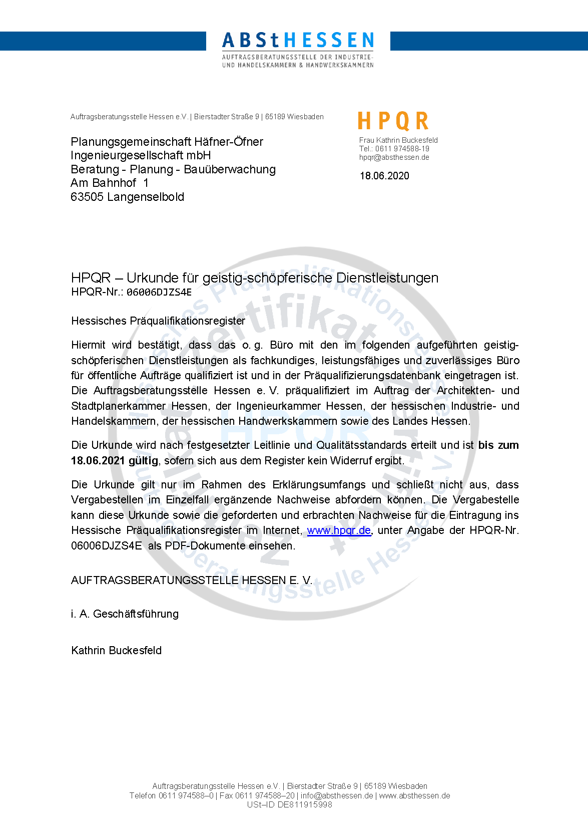 Die ABSt Hessen – Auftragsberatungsstelle Hessen e. V., Wiesbaden, hat unserer Gesellschaft mit Schreiben vom 18.06.2020 bescheinigt, dass wir auch in 2020 als fachkundiges, leistungsfähiges und zuverlässiges Büro für öffentliche Aufträge qualifiziert sind.